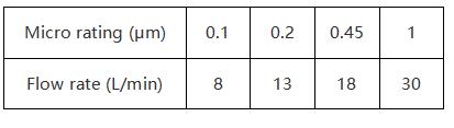 | Pure water flow rate reference table: the initial value of 10"cartridge L/min (△P=0.01MPa, 1cP, 25℃) |