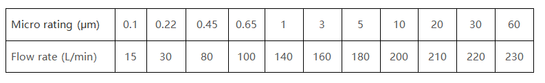 | Pure water flow rate reference table: the initial value of 10"cartridge L/min (△P=0.01MPa, 1cP, 25℃) |