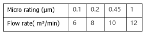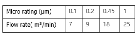 | Air flow rate reference table: the initial value of 10" cartridge m3/min(△P=0.01MPa) |